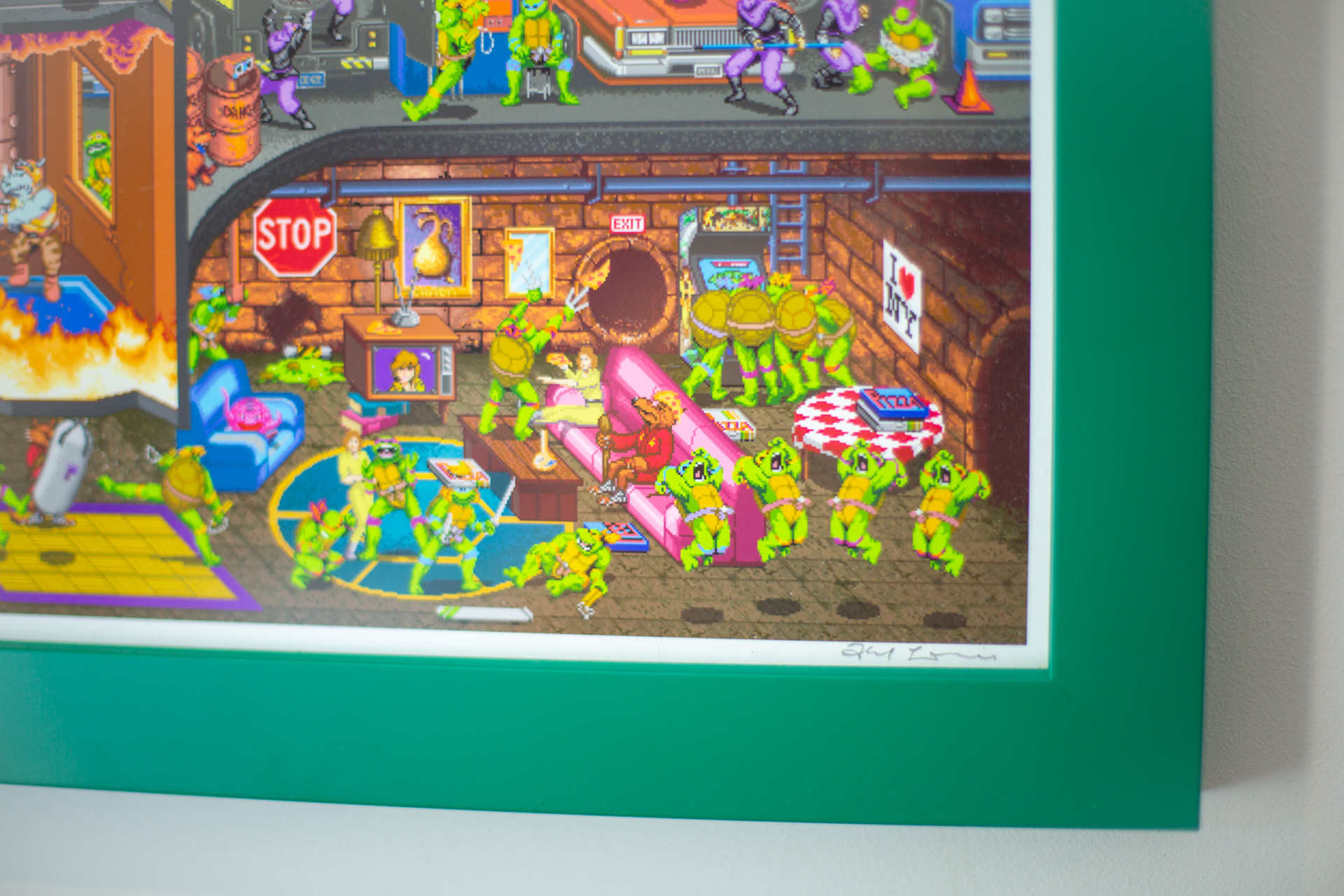 I was two years old when the first TMNT comic was published by Kevin Eastman and Peter Laird, but by the time I was seven, the groundbreaking arcade game and record breaking movie had been released and all of popular culture seemed to centre around the Ninja Turtles. We had the games, the t-shirts, the action figures and everyone had their favourite turtle (Donatello, obviously). This print commissioned by iam8bit and licensed by Nickelodeon was a labour of love and a real trip down memory lane for me revisiting the films, cartoons, comics and toys to pack this piece full of references that TMNT fans can pore over.